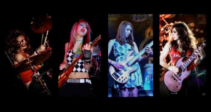 Bloody Mary is a Chicago-based, all-girl teenage rock band that made its performance debut in 2010. Known for their unique sound and impressive array of original music, this dedicated group of girls has performed at large venues like the Congress and Arcada Theaters and smaller, more intimate clubs like Penny Road Pub, Chicago Loop, Bannerman’s, and Brauer House. Bloody Mary has also made appearances at national events such as the NAMM (National Associaion of Music Merchants) and the Indianapolis Metal Fest for both 2012 and 2013. The band released their first CD “Coming of Age” in the summer of 2012 on the Dark Star Records Label and are currently working on their second album. Bloody Mary is: Hollie Wood on Bass/Vocals, Ana Apollo on Lead Guitar/Vocals, Rickee Divine on Guitar/Vocals and Kat Cannons on Drums/Vocals.